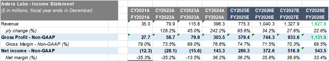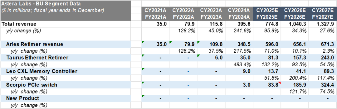 业绩表现非常强劲,规模化收入仍在前方Astera的表现远超预期,收入较预期高出10%,9月季度指引较预期高出14%,毛利率同样超出预期。正如预期,交换机收入开始放量,但Aries(retimer)和Taurus(主动线缆)业务也仍在增长。Scorpio P Switch已开始出货,Scorpio X也已产生预生产收入;此前有关X版本将提前发布的媒体猜测并不准确。当前公司已有10多家Switch客户在洽谈中——几乎涵盖所有潜在客户——这一强劲管线的大部分业务将在未来几个季度开始放量。