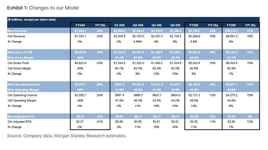 预测调整我们现在预测三季度营收为87.3亿美元,non-GAAP毛利率为54.1%,non-GAAP运营利润率为24.8%,每股收益为1.16美元。2025财年,我们上调预测至334.19亿美元营收,52.0% non-GAAP毛利率,EPS为4.28美元(此前为324.13亿/52.5%/4.20美元)。2026财年,我们预计收入增长20%,总营收为400.44亿美元,non-GAAP毛利率为55.9%,EPS为6.13美元(此前为389.20亿/55.7%/6.12美元)。