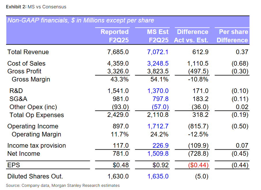 关于股价的看法我们此前的投资逻辑是,AMD可凭借AI业务,尤其是中国市场和传统客户带来的潜在上行空间,维持较高的估值溢价。但当前的营收表现并未推动我们显著上调2025年的AI收入预期。中国市场仍可能带来上行,但管理层对该市场的表态比预期更为谨慎。在当下AI投资热潮空前强劲的背景下,AMD缺乏短期催化的现状使我们难以兴奋,特别是考虑到该股目前的估值仍高于已经开始兑现AI上行的公司。
